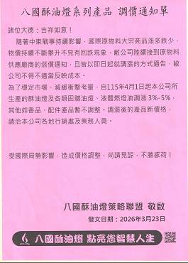 八國酥油燈自115年4月1日起價格調漲通知.